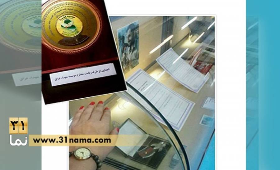 در گوشه ی دیگر از موزه مدالی بود که زیر آن نوشته شده است: اهدایی از طرف ریاست محترم موسسه ی شهدای عراق ...