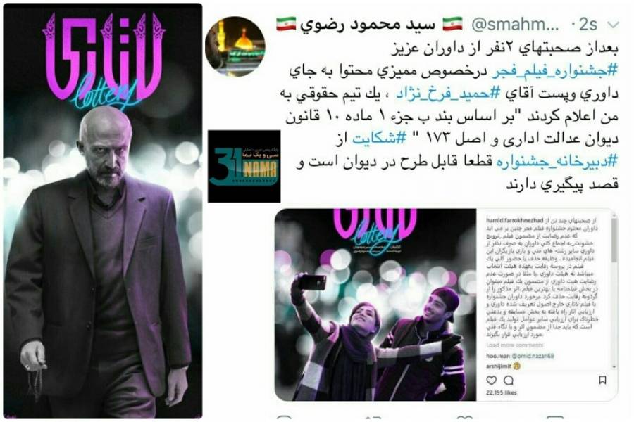«بعداز صحبتهای ٢نفر از داوران عزیز جشنواره فیلم فجر درخصوص ممیزی محتوا بهجای داوری و پست آقای حمید فرخنژاد، یک تیم حقوقی به من اعلام کردند بر اساس بند ب جزء ۱ ماده ۱۰ قانون دیوان عدالت اداری و اصل ۱۷۳ شکایت از دبیرخانه جشنواره قطعاً قابل طرح در دیوان است و قصد پیگیری دارند».