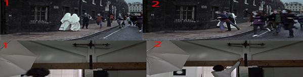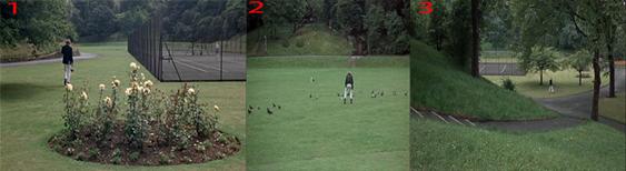 در فیلم تاماس عکاسی می کند. در واقع حقیقت از چشمانش پنهان است و با یک وسیله یعنی دوربین (یک شیء ابژه) حقیقتی را ثبت می کند. که در ادامه تمام عکس ها و حتی جسد نیست می شوند. می خواهم به یکی از صحنه هایی که نگاه کارگردان به این معقوله قابل مشاهده است اشاره کنم، صحنه ای که تاماس برای اولین بار بعد از بیرون آمدن از عتیقه فروشی به پارک می رود و از مناظر و پرندگان عکاسی می کند، زمانی که وارد پارک می شود پشت سرش دو نفر در زمین تنیس مشغول بازی هستند هم صدای برخورد توب با راکتشان شنیده می شود و هم تصویرشان دیده می شود، در نمای بعد پسر مشغول عکاسی از پرندگان است، وقتی چند لحظه بعد دوربین مجددا پسر و در بک گراندش زمین تنیس را نشان می دهد خبری از آن دو نفر که همین چند ثانیه پیش مشغول بازی بودند نیست (توجه کنید به تصاویر زیر)